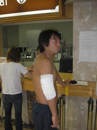 ①まずは傷を洗う : シャワーでぬるま湯をビシャー。超~いてー ②治療台でさらに消毒 : もう痺れて痛くない。 ③麻酔 : 傷の周りにプスプス。いてー ④縫合開始 : オンビートで浅田龍太郎にお願いしたい。 ⑤包帯巻いて終了 傷は深いが脂肪層までで筋膜、血管に損傷なし。なるほどプロレスラーがケガに強いわけだ。 ふてくされ顔でお会計を済ませて帰還。 10時出発。波ヲタと「やっぱり脂肪付けとないとダメだな~」などと、あーでもない、こーでもないとお話ししながら12時波ヲタ宅到着。 水もたくさん余り、せっかくなので血だらけの海パンを波ヲタに洗わせた。なぜかというと俺がケガをした66%は波ヲタと一緒の時なのである。 海パンもきれいになって、板は運べないので波ヲタに預けて俺も帰還。時間をおうごとに傷が痛んでくる。この記事書くのも一苦労だぜ。 ということで、またしばらく波乗りはお預け。サーヒンライフ異状なし。 PR