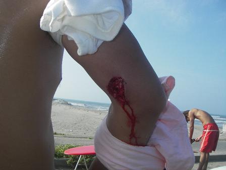 今日はひさしぶりに波ヲタと波乗りにでかけた。 鹿嶋に行くつもりだったが、なぜか吉崎にきちゃった。 風はサイド弱、波は予想外に小さく腹~胸。 風は弱いしとりあえず入ることにした。 7:00~セット胸くらい? いつもの左堤防からパドルしてやや左に流れる。テトラに向かってテイクオフって感じ。 1本レギュラー乗って、戻ってグフィーにテイクオフしようとしたら、レイトぎみで板が刺さってパーリング!テールが右腕に当たってタッパーが破れた。そこまでは自分で解って海に落ちた。 頭出して破れたとこに指をやったらポッコリ穴が開いてるー! ヤバイ怪我した。そのままスープに乗ってアウトしてくる波ヲタに「ケガした!」と声をかけて上がる。 アドレナリン満タンの俺はそれほど痛みを感じない。むしろ傷を見た波ヲタが慌てる。即座に撤収。パックリ6cmは開いてる。サメに喰われたー。 7:30 本日30分1本勝負でした・・・・