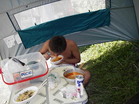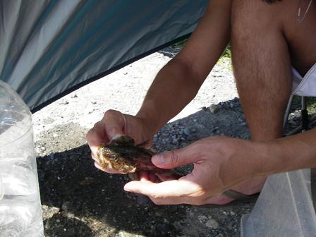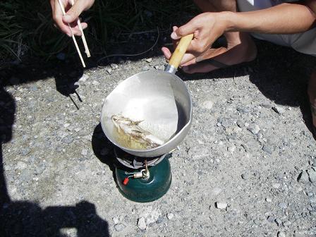 タープも出してモグはミートソースでおいしそう。 俺は明太子スパでマイウ~ パスタを食ったら昨日のカサゴを思い出した。 モグがさばいて、から揚げを開始。